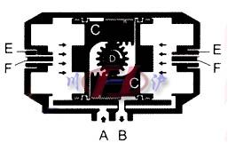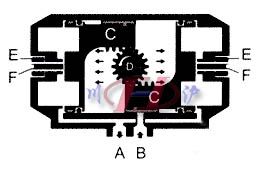 壓縮空氣從氣口(B)進(jìn)入氣缸兩活塞(C)之間中腔時(shí),使兩活塞分離向氣缸兩端方向移動(dòng),迫使兩端的彈簧壓縮,兩端氣腔的空氣通過(guò)氣口(A)排出,同時(shí)使兩活塞(C)的齒條同步帶動(dòng)輸出軸(D)(齒輪)逆時(shí)針?lè)较蛐D(zhuǎn)90度。在壓縮空經(jīng)過(guò)電磁閥換向后,氣缸的兩活塞在彈簧的彈力下向中間方向移動(dòng),中間氣腔的空氣從氣口(B)排出,同時(shí)使兩活塞(C)的齒條同步帶動(dòng)輸出軸(D)(齒輪)順時(shí)針?lè)较蛐D(zhuǎn)90度??梢詮膬啥苏{(diào)整微量角度,松動(dòng)螺母(E)用內(nèi)六角扳手?jǐn)Q動(dòng)調(diào)節(jié)螺栓(F)調(diào)整所需角度,鎖緊螺母(E)。 ■ 解剖圖及零配件